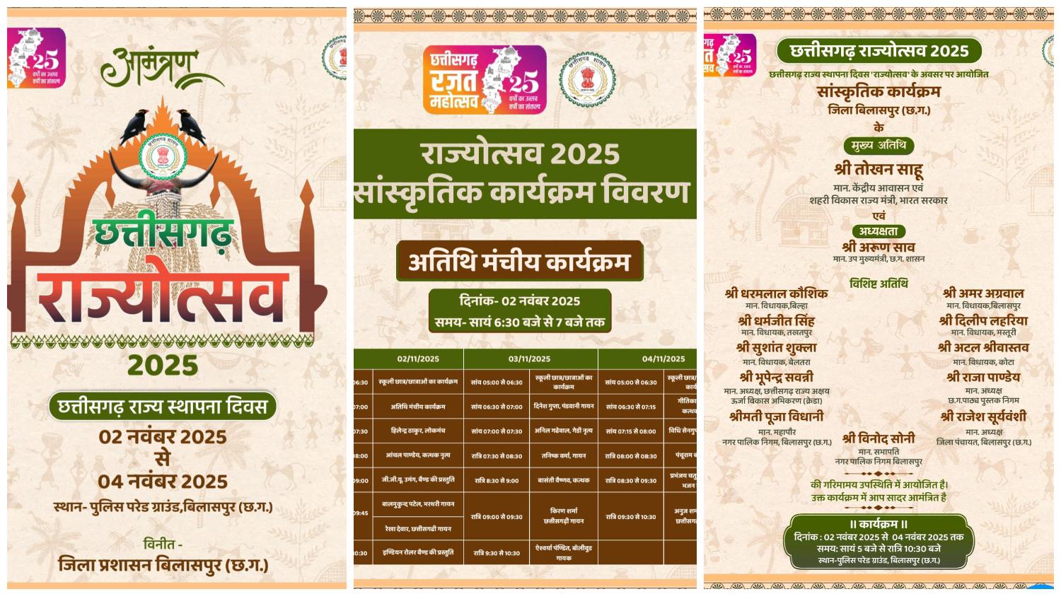 बिलासपुर // छत्तीसगढ़ राज्य स्थापना दिवस के अवसर जिला स्तरीय राज्योत्सव का भव्य आयोजन पुलिस परेड मैदान में 2 नवम्बर से 4 नवम्बर 2025 तक किया जाएगा। राज्योत्सव के पहले दिन केंद्रीय आवासन एवं शहरी विकास राज्य मंत्री श्री तोखन साहू कार्यक्रम का शुभारंभ करेंगे। कार्यक्रम की अध्यक्षता उप मुख्यमंत्री श्री अरूण साव करेंगे। विशिष्ट अतिथि के तौर पर विधायक सर्वश्री श्री धरमलाल कौशिक, श्री अमर अग्रवाल, श्री धर्मजीत सिंह, श्री सुशांत शुक्ला, श्री दिलीप लहरिया, श्री अटल श्रीवास्तव, क्रेडा के अध्यक्ष श्री भूपेन्द्र सवन्नी, छत्तीसगढ़ पाठ्य पुस्तक निगम के अध्यक्ष श्री राजा पाण्डेय, महापौर श्रीमती पूजा विधानी, जिला पंचायत अध्यक्ष श्री राजेश सूर्यवंशी, नगर निगम के सभापति श्री विनोेद सोनी शामिल होंगे।