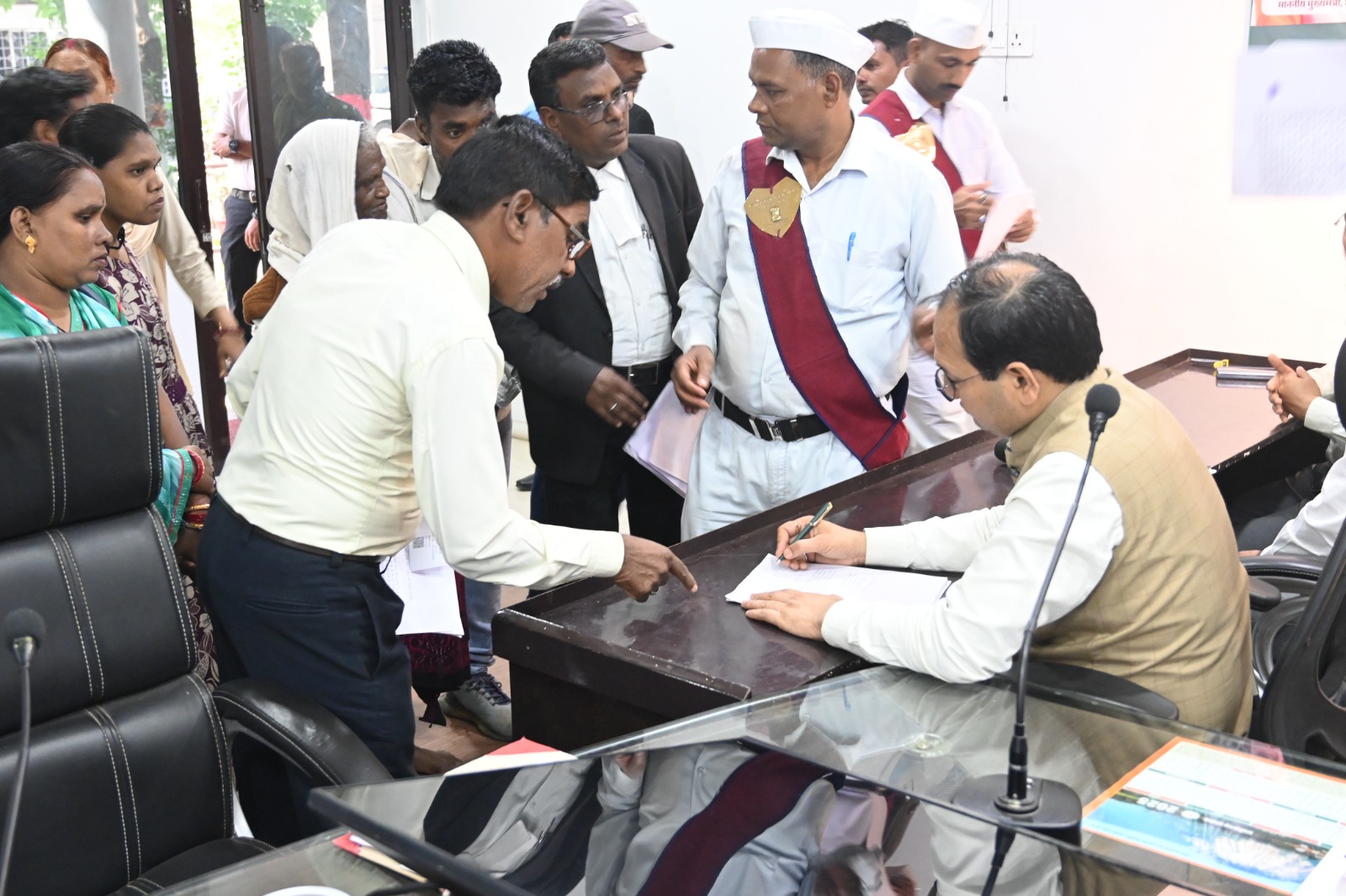 बिलासपुर // कलेक्टर संजय अग्रवाल ने साप्ताहिक जनदर्शन में दूर-दराज से पहुंचे ग्रामीणों की फरियाद सुनी। उन्होंने एक-एक कर प्रत्येक व्यक्ति से मुलाकात कर उनका आवेदन लिया और आवश्यक कार्रवाई के लिए अधिकारियों को निर्देशित किया। लोगों ने जनदर्शन में व्यक्तिगत एवं सामुदायिक हित से जुड़े विषयों को लेकर जिला प्रशासन का ध्यान आकृष्ट करते हुए आवेदन दिया। जनदर्शन में आज 65 से ज्यादा आवेदन प्राप्त हुए।