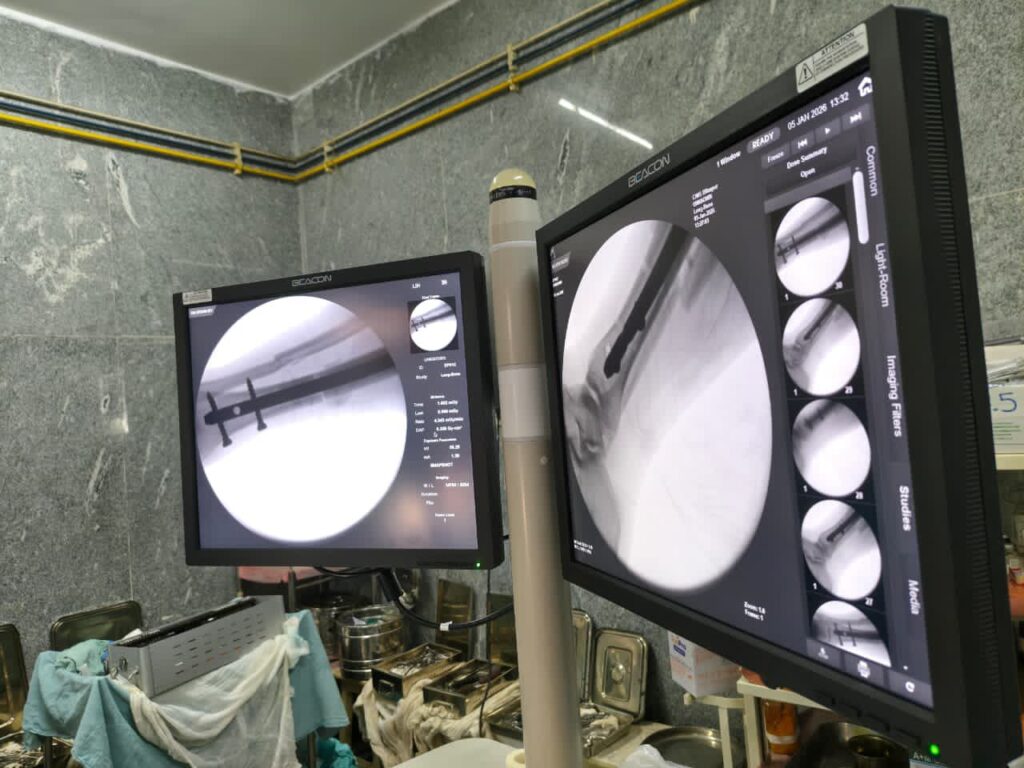 घाव भरने के पश्चात आज दिनांक 5 जनवरी 2026 को सिम्स में हाल ही में स्थापित अत्याधुनिक C-ARM मशीन की सहायता से मरीज के पैर में टीबिया नेलिंग (अंदर से रॉड डालकर हड्डी को सही स्थिति में जोड़ने) की जटिल शल्यक्रिया पूरी तरह सफल रही। C-ARM तकनीक के माध्यम से सर्जरी के दौरान हड्डी की सटीक स्थिति प्रत्यक्ष रूप से देखी जा सकी, जिससे ऑपरेशन अधिक सुरक्षित, सटीक एवं प्रभावी सिद्ध हुआ।