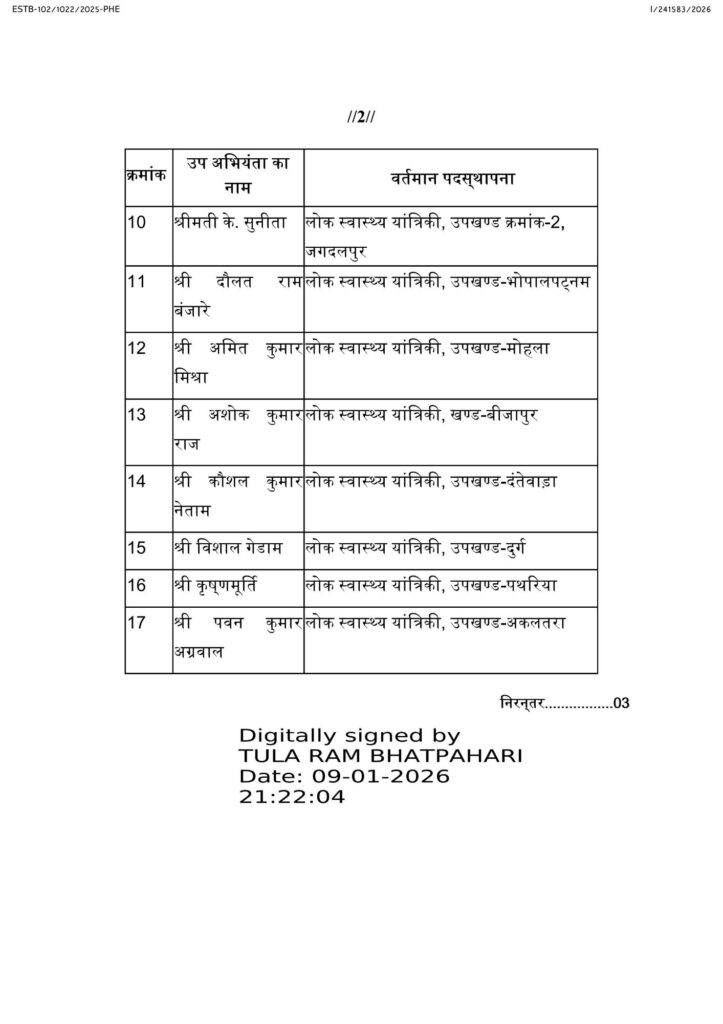 बिलासपुर :— राज्य शासन ने जल जीवन मिशन के कार्यों में तेजी लाने, लोक स्वास्थ्य यांत्रिकी विभाग के काम-काज में कसावट तथा विभागीय कार्य प्रणाली में सुधार लाने प्रशासनिक स्तर पर बड़े बदलाव किए हैं। उप मुख्यमंत्री तथा लोक स्वास्थ्य यांत्रिकी मंत्री श्री अरुण साव के निर्देश पर विभाग ने वरिष्ठ स्तर पर राज्य कार्यालय, जल जीवन मिशन मुख्यालय और मैदानी कार्यालयों के 34 अधिकारियों का स्थानांतरण व जिम्मेदारी बदल दी गई है। विभाग ने मैदानी स्तर पर कार्यों को और गति देने 26 उप अभियंताओं को सहायक अभियंता के रूप में पदोन्नत किया है।