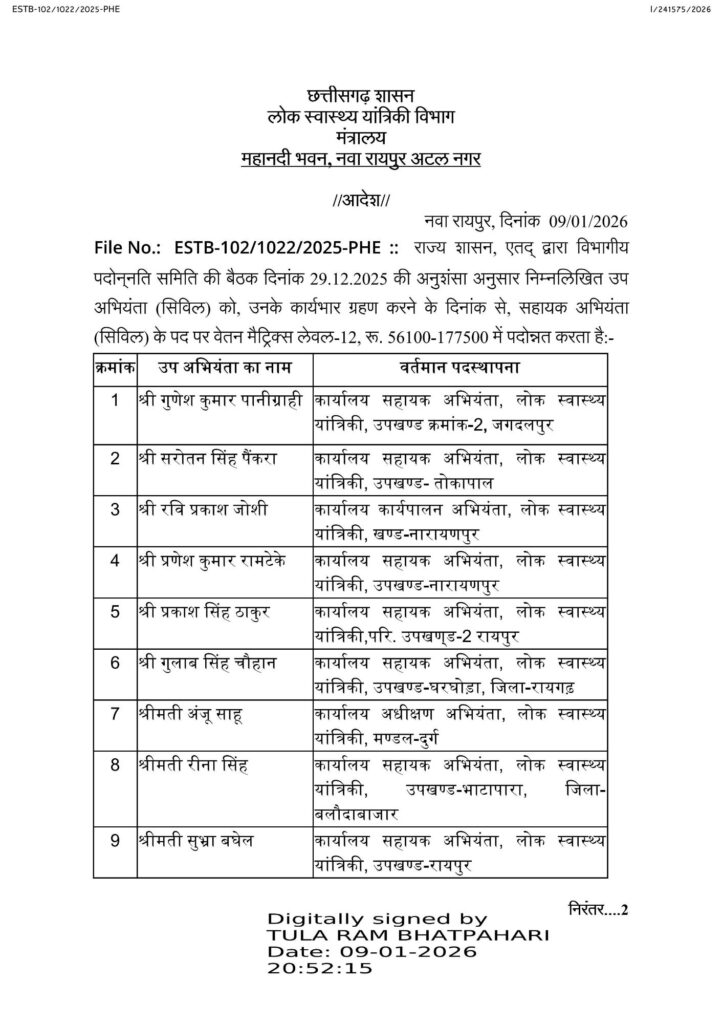 लोक स्वास्थ्य यांत्रिकी विभाग ने 26 उप अभियंताओं (सिविल) के सहायक अभियंता (सिविल) के पद पर पदोन्नति के आदेश जारी किए हैं। इनमें सर्वश्री गुणेश कुमार पानीग्रही, सरोतन सिंह पैंकरा, रवि प्रकाश जोशी, प्रणेश कुमार रामटेके, प्रकाश सिंह ठाकुर, गुलाब सिंह चौहान, दौलत राम बंजारे, अमित कुमार मिश्रा, अशोक कुमार राज, कौशल कुमार नेताम, विशाल गेडाम, कृष्णमूर्ति, पवन कुमार अग्रवाल, अमित राय, आलोक मंडल, श्रीमती अंजू साहू, श्रीमती रीना सिंह, श्रीमती सुभ्रा बघेल और श्रीमती के. सुनीता शामिल हैं।