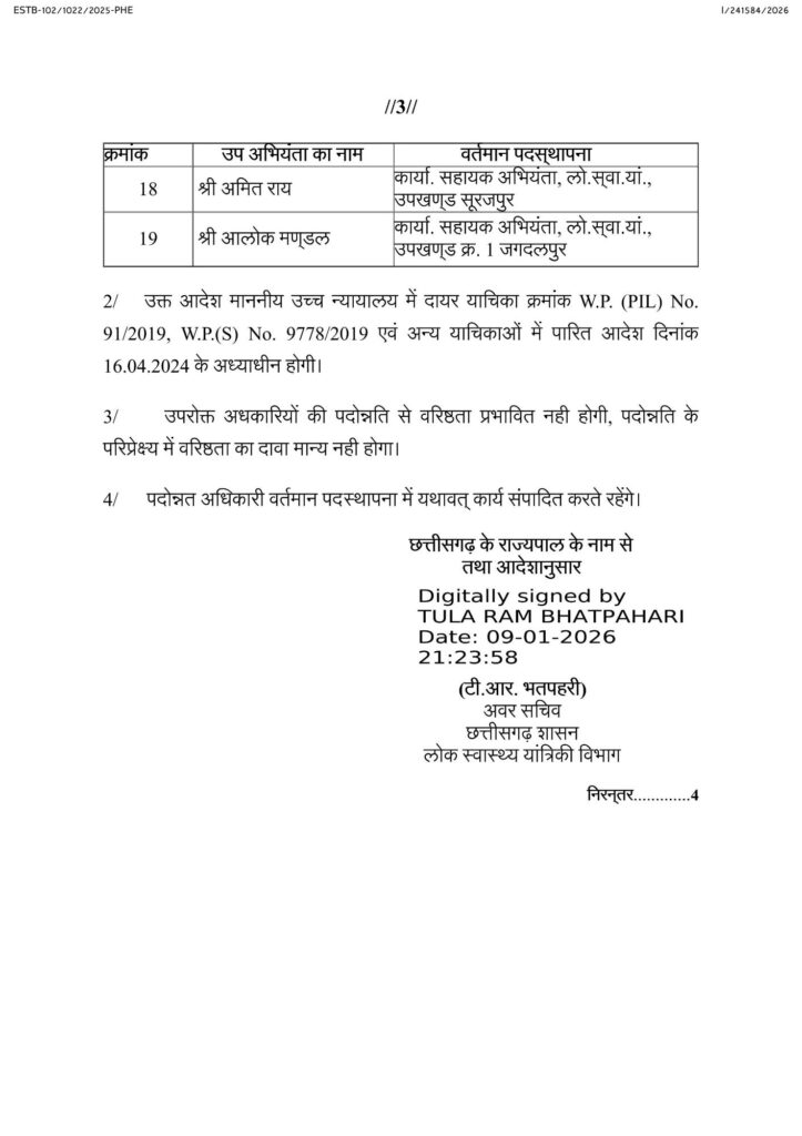 विभाग ने सात उप अभियंताओं को परिभ्रमण से मुक्त करते हुए सहायक अभियंता के रूप में पदोन्नति दी है। इनमें सर्वश्री विनोद कुमार सिंह, रेवेन्द्र महोबिया, प्रमोद कुमार महतो, डेमन लाल देशमुख, रूपचंद सूर्यवंशी, सत्यनारायण सिंह कंवर और विमलेश कुमार सिंह शामिल हैं।