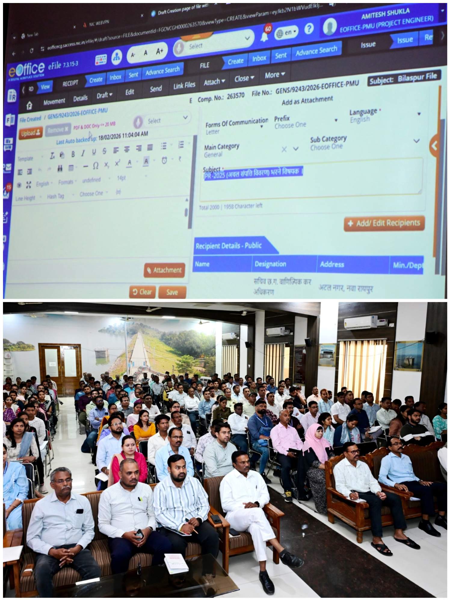 बिलासपुर :— शासकीय कार्यों में पारदर्शिता, त्वरित निस्तारण एवं कार्यालयीन प्रक्रियाओं को डिजिटल माध्यम से सुगम बनाने के उद्देश्य से प्रार्थना भवन सभाकक्ष में ई-ऑफिस संबंधी प्रशिक्षण कार्यक्रम आयोजित किया गया। इसमें विभिन्न विभागों के अधिकारी एवं कर्मचारियों ने सहभागिता की।