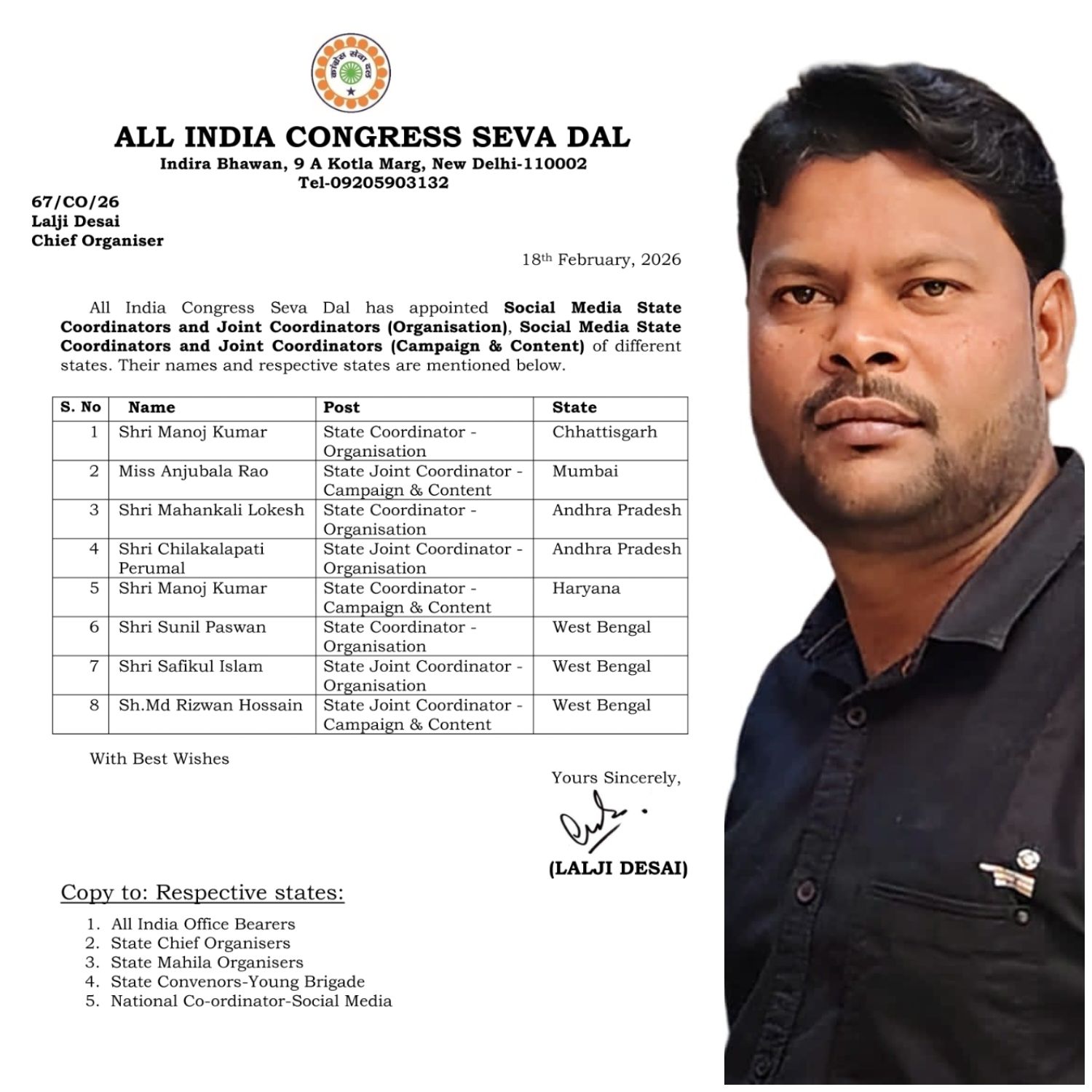 बिलासपुर :— अखिल भारतीय कांग्रेस सेवादल सोशल मीडिया, छत्तीसगढ़ के प्रदेश संयोजक के रूप में मनोज कुमार पाटेकर को महत्वपूर्ण जिम्मेदारी सौंपे जाने पर प्रदेशभर में हर्ष का वातावरण है। इस नियुक्ति के लिए संगठन प्रमुख आदरणीय लालजी देसाई, राष्ट्रीय संयोजक परवीन, सेवादल यंग ब्रिगेड छत्तीसगढ़ की प्रदेश अध्यक्षिका मनोरमा पाटेकर एवं सेवादल सोशल मीडिया के सभी सम्मानित सदस्यगणों के प्रति उन्होंने हृदय से आभार व्यक्त किया।