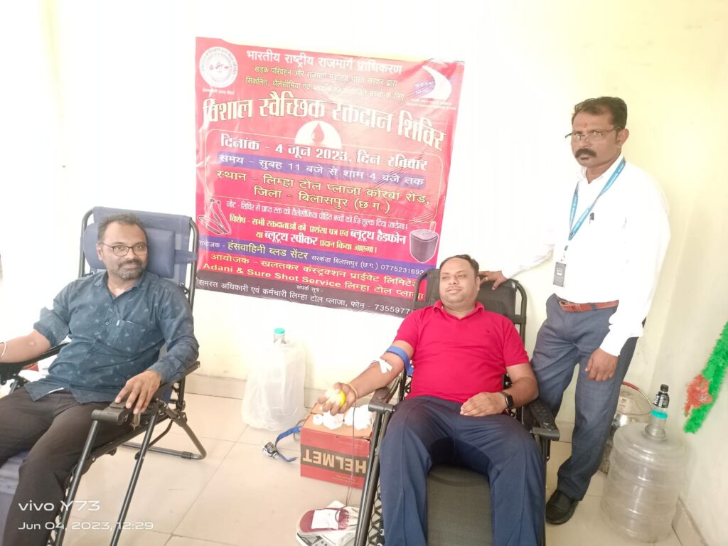 बेलतरा विधानसभा क्षेत्र के अंतर्गत ग्राम लिम्हा में स्थित लिम्हा टोल प्लाजा में 4 जून को संयोजक – हंसवाहिनी ब्लड सेंटर सरकंडा बिलासपुर एवं आयोजक – खलतकर कन्स्ट्रक्शन प्राईवेट लिमिटेड लीम्हा टोल प्लाजा के सयुक्त तत्वाधान में भारतीय राष्ट्रीय राजमार्ग प्राधिकरण