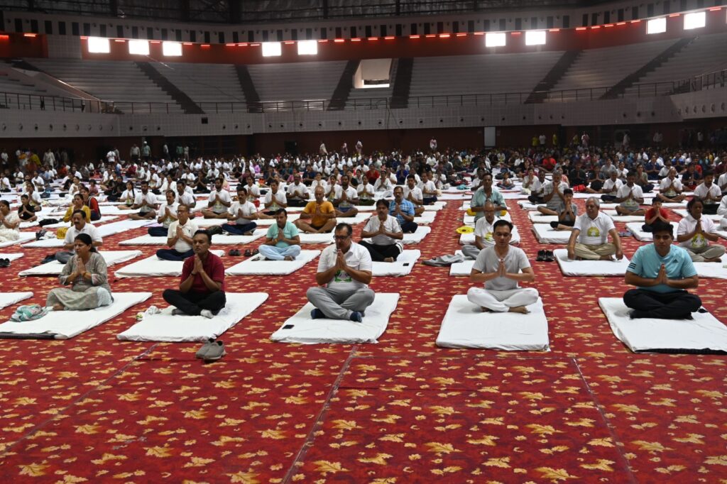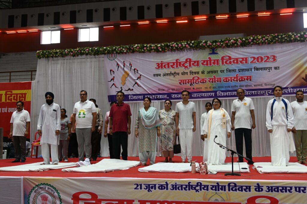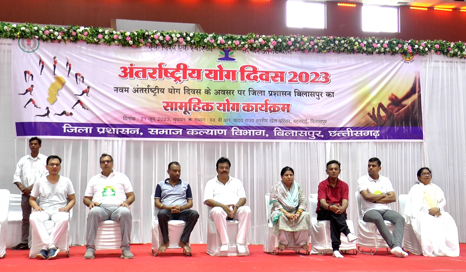 बिलासपुर / नौवें अंतर्राष्ट्रीय योग दिवस के अवसर पर उत्साह एवं खुशी के माहौल में जिला स्तरीय योगाभ्यास कार्यक्रम का आयोजन बहतराई इंडोर स्टेडियम में हुआ। एक विश्व एक स्वास्थ्य थीम एवं हर घर आंगन योग संदेश पर केंद्रित यह कार्यक्रम संसदीय सचिव श्रीमती रश्मि आशीष सिंह के मुख्य आतिथ्य में हुआ। इस दौरान जिला पंचायत अध्यक्ष श्री अरूण सिंह चौहान, जिला पंचायत सदस्य श्री अंकित गौरहा, जिला सहकारी केंद्रीय बैंक के अध्यक्ष श्री प्रमोद नायक, संभागायुक्त श्री भीम सिंह, कलेक्टर श्री सौरभ कुमार, श्री विजय केशरवानी ने भी योगाभ्यास किया। हजारों की संख्या में बच्चों एवं नागरिकों ने योगाभ्यास एवं प्राणायाम किया। इस अवसर पर ब्रम्हाकुमारी दीदी मंजू सहित सात से अधिक योग प्रशिक्षकों, योगाचार्याें के मागदर्शन में प्रतिभागियों द्वारा योगाभ्यास, ताड़ासन, वक्रासन, प्राणायाम जैसे अनुलोम विलोम, कपालभाति, भुजंगासन, भ्रामरी जैसे आसानों का अभ्यास एवं ध्यान किया गया।