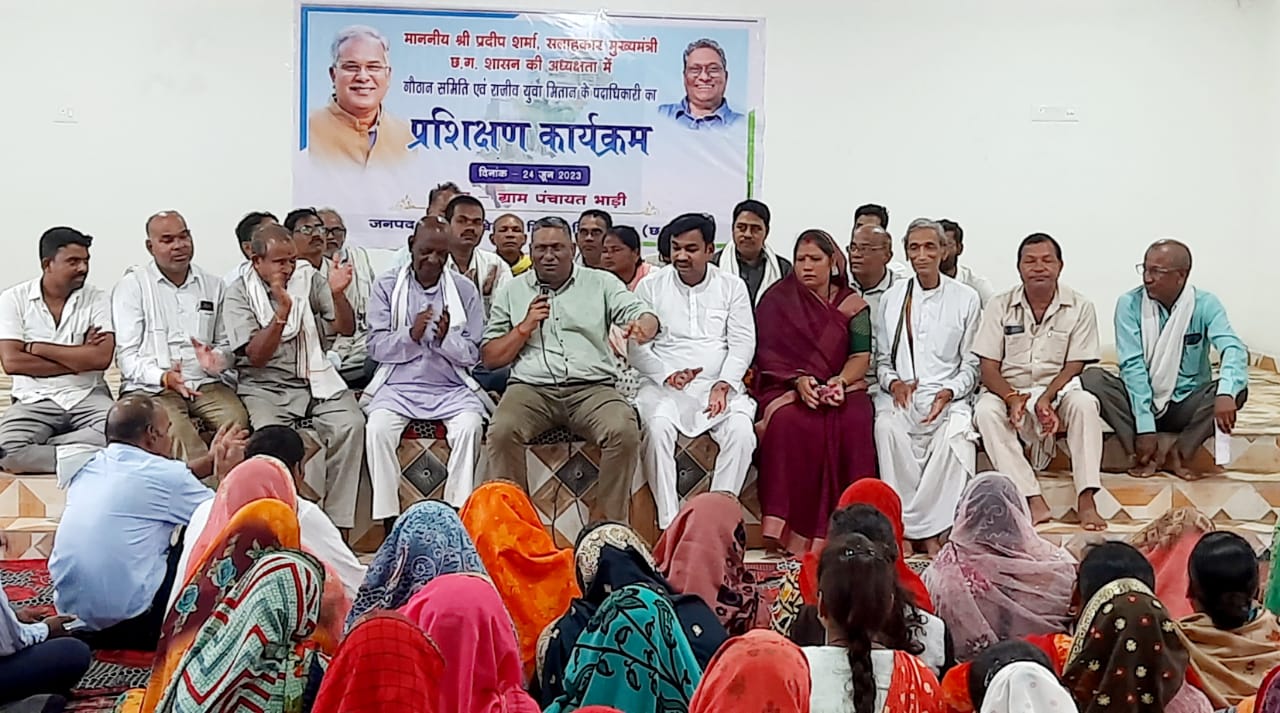 उमलेश जायसवाल बेलतरा ;– बेलतरा विधानसभा क्षेत्र ग्राम पंचायत भाड़ी में माननीय श्री प्रदीप शर्मा सलाहकार मुख्यमंत्री छत्तीसगढ़ शासन की अध्यक्षता में गौठान समिति एवं राजीव गांधी युवा मितान के पदाधिकारी का प्रशिक्षण कार्यक्रम में शामिल हुए। साथ ही छाया विधायक राजेंद्र साहू (डब्बू), रमेश कौशिक, रामरतन कौशिक ब्लॉक अध्यक्ष एवं वरिष्ठ कांग्रेसी भी उपस्थित रहे।