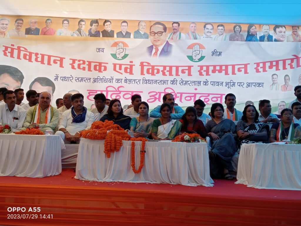सेमरताल – ब्लाक कांग्रेस कमेटी बेलतरा के बैनरतले सेमरताल के स्कूल मैंदान में संविधान रक्षक एवं किसान सम्मान समारोह का ऐतिहासिक आयोजन किया गया। जिसमें मुख्य अभ्यागत एवं वक्ता भारतीय राष्ट्रीय कांग्रेस के अनुसूचित जाति प्रकोष्ठ अध्यक्ष राजेश लिलोठीया जी थे। समारोह में बेलतरा विधानसभा के एक हजार किसानों को श्रीफल, शाल, एवं संविधान रक्षक प्रमाण पत्र भेंट कर सम्मान किया गया। साथ ही सक्रिय कांग्रेस कार्यकर्ताओं , पत्रकारों को भी सम्मानित किया गया। सावन के महीने में आयेजित कार्यक्रम में खेती किसानी के बावजूद क्षेत्र केे किसानों की अपार उपस्थिति ने कांग्रेस के इस आयोजन को ऐतिहासिक बना दिया। इस सम्मेंलन के लिए तैयार किया गया पंडाल सेमरताल में बनाया गया आज तक का सबसे बड़ा पंडाल था। समारोह की शुरुवात भारतमाता, छत्तीसगढ़ महतारी एवं संविधान निर्माता डा. भीमराव अंबेडकर की प्रतिमा में पुष्पार्पण व दीप प्रज्जवलन के साथ मुख्य अभ्यागत सहित सभी अतीथियों के द्वारा किया गया। मंच में अतीथियों की आसंदी पर चुन्नीलाल साहू प्रदेश उपाध्यक्ष छ.ग. प्रदेश कांग्रेस कमेटी, विजय केशरवानी, राजकुमार अंचल प्रदेश अध्यक्ष कांग्रेश कमेटी अनु. जाति विभाग, डा. चोलेश्वर चंद्राकर प्रदेश अध्यक्ष कांग्रेस कमेटी पिछड़ा वर्ग, रामविलास साहू प्रदेशाध्यक्ष कांग्रेस कमेटी अनु. जन. जाति, जनकराम धु्रव, पवन रात्रे राष्ट्रीय समन्वयक कांग्रेस कमेटी, शेषराज हरवंश प्रदेश अध्यक्ष महिला प्रदेश कांग्रेस कमेटी, प्रकाश मारतंडे कार्यकारी प्रदेशाध्यक्ष कांग्रेस कमेटी अनु. जाति विभाग, रोमा परसराम भारद्वाज मीडिया प्रभारी कांग्रेस कमेटी अनु. जाति विभाग उपस्थित थी। मंचस्थ अभ्यागतों का स्वागत झगरराम सूर्यवंशी, विनोद साहू, सत्येन्द्र कौशिक, राजेन्द्र साहू, इं. लक्ष्मीकुमार गहवई ने किया। स्वागत के बाद राजेश लिलोठिया ने सभा को संबोधित करते हुए कहा कि आज हमारे देश की सत्ता ऐसे लोगों के हाथ में चली गई है, जो संविधान के लिए खतरा हो गया है। सत्तासीन दल अपनी गल्तियों के विरुद्ध बोलने वालों को संसद से बाहर कर देती है। जो लोग भाजपा के गलत नीतियों को बताते हैं उन्हें देशद्रोही करार दिया जाता है। नरेन्द्र मोदी की नीतियों की वजह से आज पिछले दो महीने से मणिपुर जल रहा है। प्रधानमंत्री जी विदेश घूमते हैं। उन्हें संसद में जवाब देने की फुर्सत नहीं बल्कि चुनावी सभाओं के लिए स्तरहीन बोलने का भरपुर समय है। आज हम सबको डा. भीमराव के लिखे संविधान की रक्षा के लिए शपथ लेकर, संविधान रक्षक बनना है। आज की माता – पिता से आग्रह है कि वे अपने बच्चों को ज्यादा से ज्यादा पढ़ाएँ। कांग्रेस ही वह दल है, जहाँ महिलाओं का सम्मान किया जाता है। आगे लिलोठि