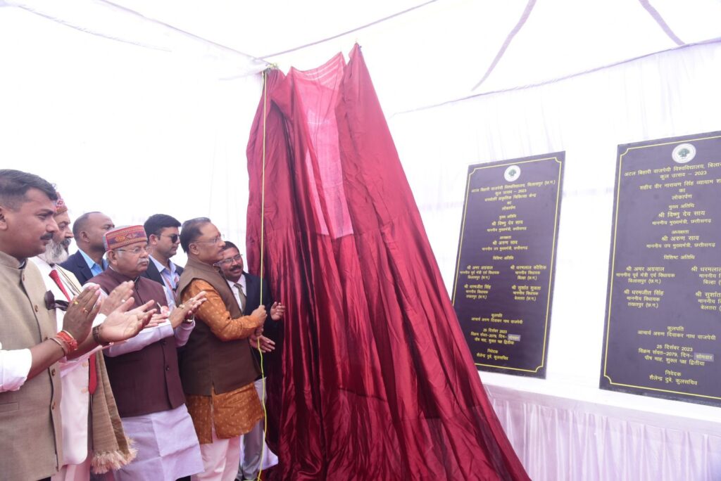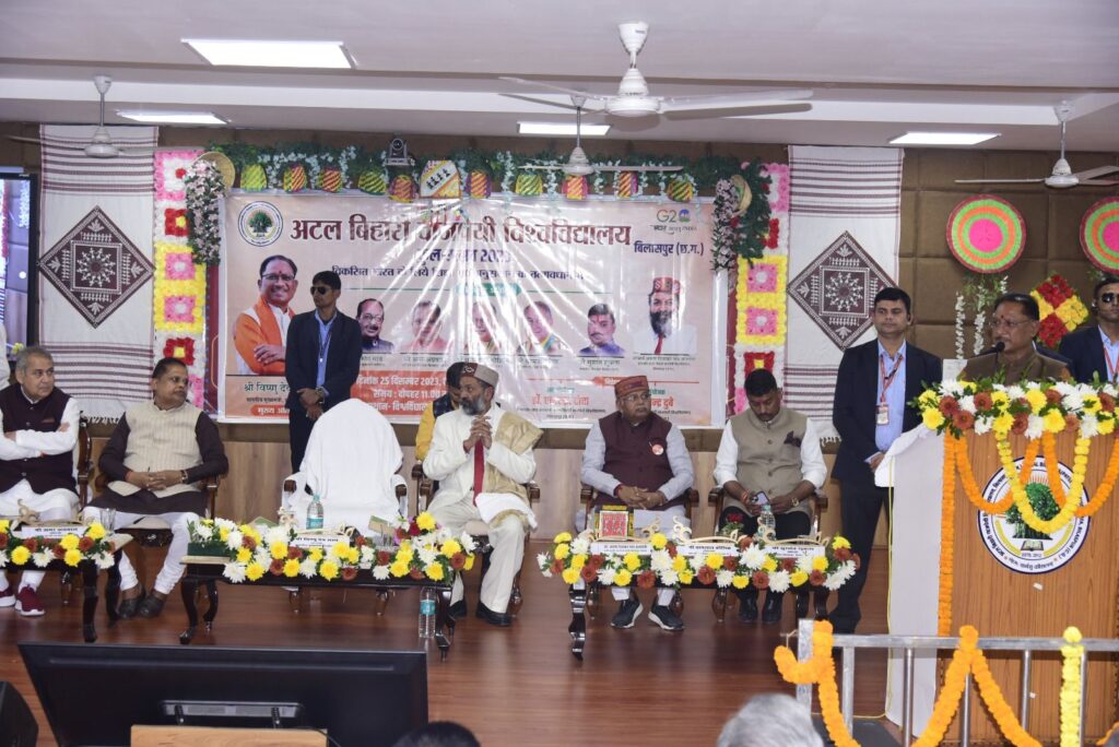 मुख्यमंत्री श्री विष्णुदेव साय ने आज अटल बिहारी विश्वविद्यालय, में आयोजित कुल उत्सव में शामिल हुए। इस अवसर पर मुख्यमंत्री श्री साय ने धनवंतरी प्राकृतिक चिकित्सा केन्द्र, विश्वविद्यालय के प्रमुख मार्ग ज्ञानपथ सहित विश्विद्यालय परिसर में बनाए गए शहीद वीर नारायण सिंह व्यायाम शाला का लोकार्पण किया।