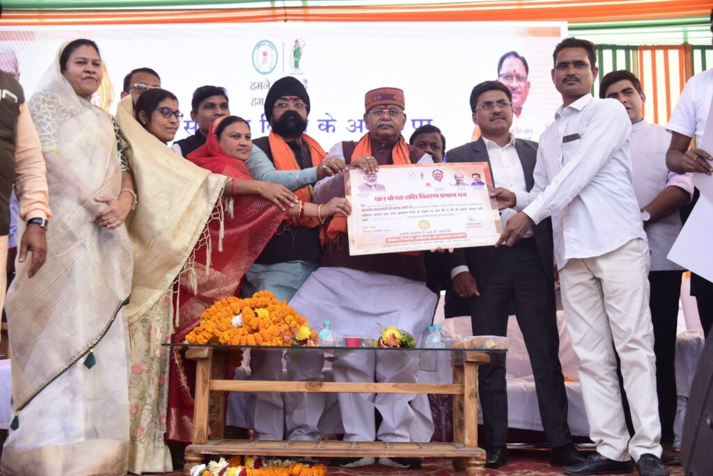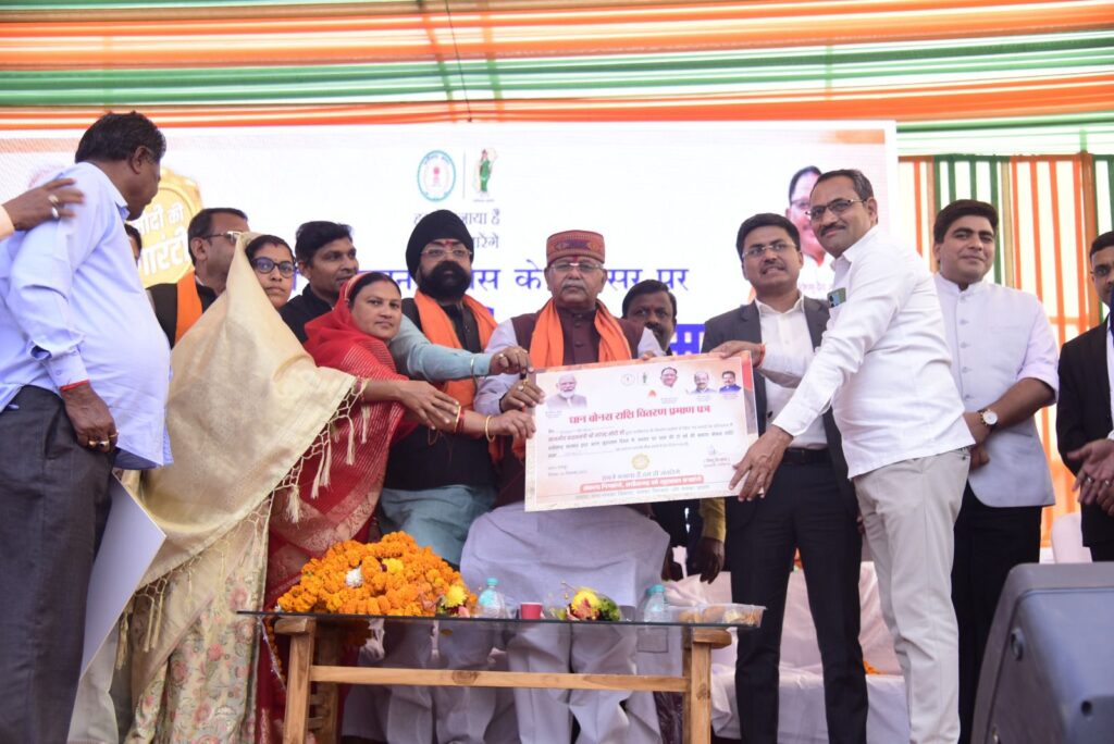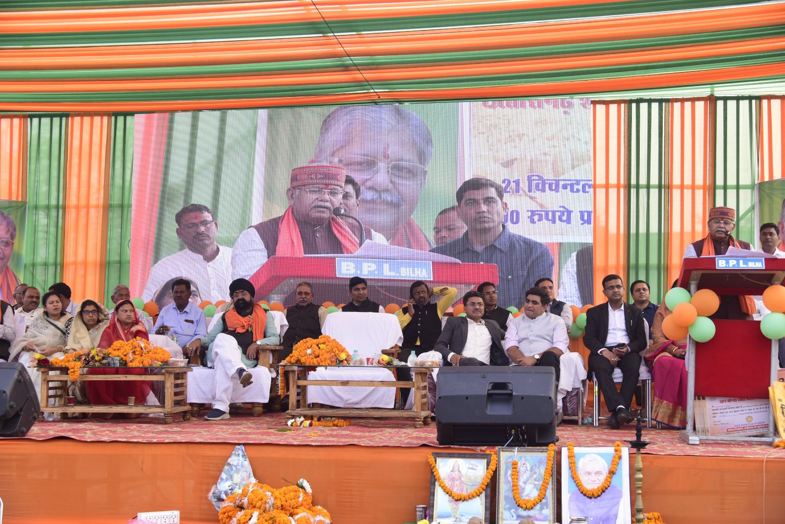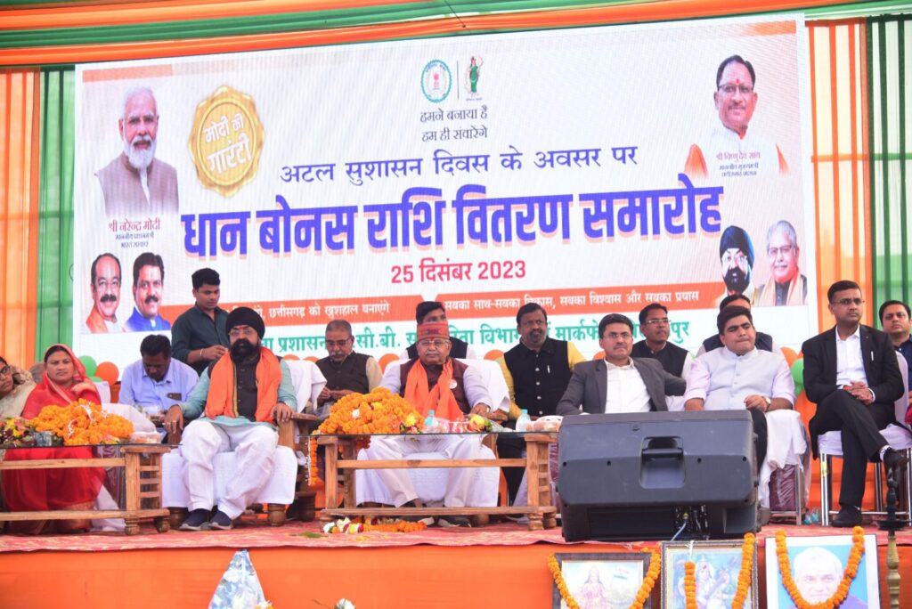 बिलासपुर -//- मुख्यमंत्री श्री विष्णुदेव साय ने छत्तीसगढ़ राज्य के निर्माता एवं पूर्व प्रधानमंत्री श्री अटल विहारी वाजपेयी की जयंती के मौके पर वीसी के जरिए बिलासपुर सहित राज्य के किसानों को दो साल के बकाया बोनस राशि का वितरण किया। उन्होंने रायपुर के ग्राम बेन्द्री (अभनपुर)में आयोजित राज्य स्तरीय समारोह में कम्प्यूटर का बटन दबाकर बोनस वितरण का शुभारंभ किया। उन्होंने वीसी के जरिए सम्बोधित करते हुए कहा कि 18 लाख आवास निर्माण की स्वीकृति के बाद 12 लाख किसानों को 3716 करोड़ रूपये का बोनस वितरित कर हमने मोदी जी की दूसरी बड़ी गारण्टी को पूरा किया है। उन्होंने भरोसा दिलाया कि पांच साल में मोदी की हर गारण्टी शिद्दत के साथ पूरी की जायेगी। बोनस वितरण का जिला स्तरीय समारोह बिल्हा मण्डी प्रांगण में संपन्न हुआ। विधायक श्री धरमलाल कौशिक मुख्य अतिथि थे। जिले की 62 हजार से ज्यादा किसानों को 197 करोड़ रूपये का फायदा बोनस वितरण योजना से हुआ है।