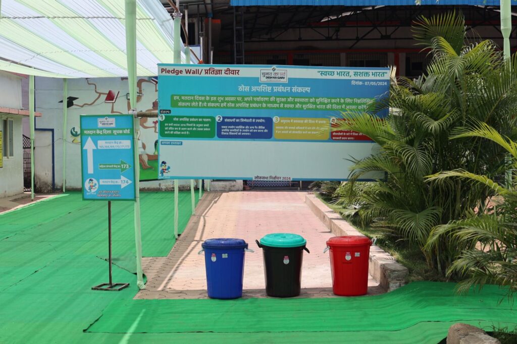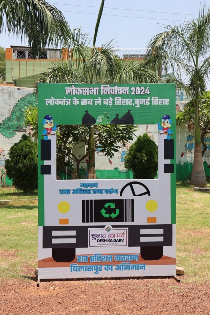 बिलासपुर // जिले में 7 मई को होने वाले लोकसभा चुनाव के लिए जिला प्रशासन द्वारा सभी तैयारियां पूर्ण कर ली गई है। महिलाओं को लोकतंत्र में महत्वपूर्ण जिम्मेदारी देते हुए संगवारी महिला मतदान केंद्र में इनकी ड्यूटी भी लगाई गई है। सभी निर्वाचनों में मतदाताओं की सुविधा का विशेष ध्यान रखा जाता है। इस बार भी जिला प्रशासन द्वारा मतदाताओं को मतदान और स्वच्छता के प्रति प्रेरित करने बिलासपुर विधानसभा क्षेत्र के शेख गफ्फार आत्मानंद उत्कृष्ट विद्यालय में बनाए गए संगवारी महिला मतदान केंद्र क्रमांक-173 को सॉलिड वेस्ट मैनेजमेंट की थीम पर तैयार किया गया है। इस मतदान केंद्र में पंहुचने वाले मतदाता, न केवल सिर्फ लोकतंत्र के यज्ञ में आहूति देंगे बल्कि स्वच्छता और पर्यावरण सरंक्षण के प्रति जागरूक भी होंगे। यहां बनाए गए गार्बेज ट्रक शेप सेल्फी स्टैंड जहां मतदान के बाद मतदाता सेल्फी लेकर मतदान और स्वच्छता दोनों का संदेश देंगे। कचरे के सेग्रिगेशन को बताने चार अलग-अलग रंग के डस्टबिन भी रखें गए हैं। इस मतदान केंद्र में एक ओर प्रतिज्ञा दीवार बनाई गई है, जहां लोकतंत्र की रक्षा और स्वच्छता को बनाएं रखने प्रतिज्ञा ली जाएगी। हरा, नीला और सफेद रंग से सजा यह मतदान केंद्र सॉलिड वेस्ट मैनेजमेंट को समर्पित है। A
