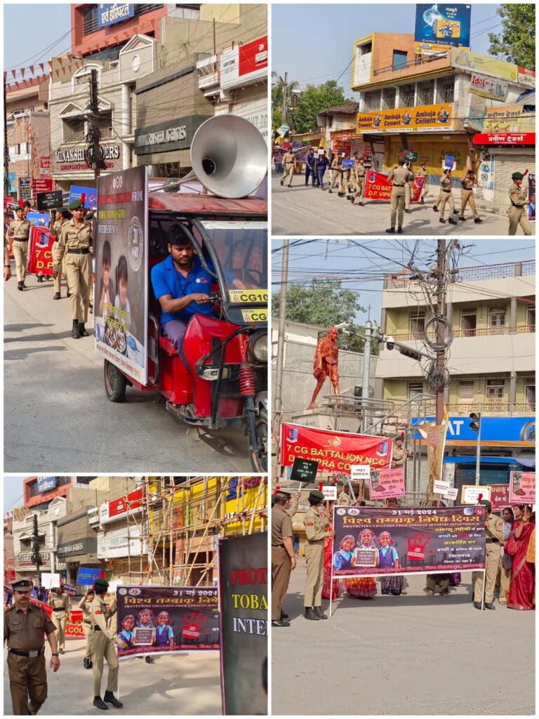 बिलासपुर // विश्व तम्बाकू निषेध दिवस के अवसर पर डीपी विप्र महाविद्यालय के एनसीसी छात्रों ने महाविद्यालय प्रांगण से गांधी चौक तक जन जागरूकता रैली निकाली। रैली में एनसीसी कैडेट एवं शहरी मितानीनों ने बड़े उत्साह के साथ भाग लिया। मुख्य चिकित्सा एवं स्वास्थ्य अधिकारी डॉ. प्रभात कुमार श्रीवास्तव ने रैली को हरी झण्डी दिखाकर रवाना किया। रैली के समापन उपरांत महाविद्यालय परिसर में एनसीसी विंग अधिकारी द्वारा तंबाकू के किसी भी प्रकार का सेवन न करने हेतु शपथ दिलाई गई। कार्यक्रम में जिला नोडल अधिकारी डॉ. बी.के. वैष्णव, जिला कार्यक्रम प्रबंधक सुश्री पियुली मजुमदार, एवं स्वास्थ्य विभाग के अधिकारी-कर्मचारी उपस्थित थे।