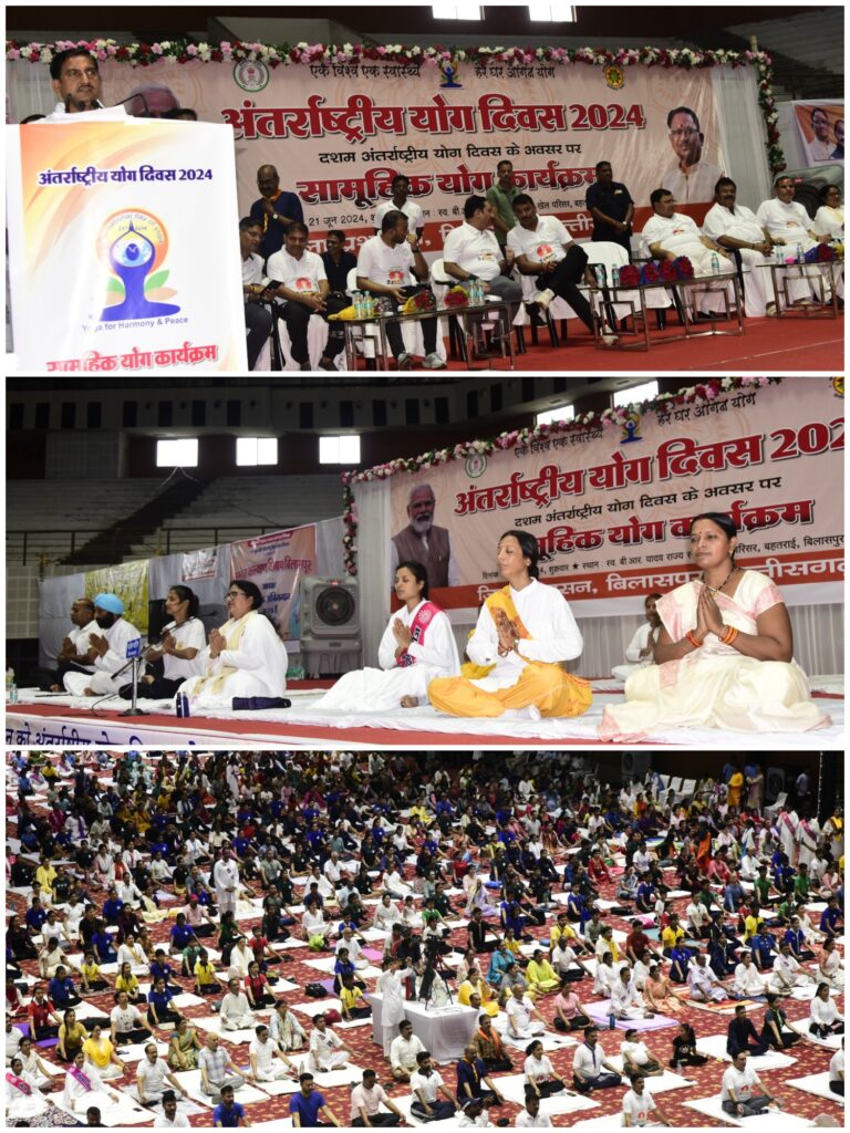 बिलासपुर // अंतर्राष्ट्रीय योग दिवस के अवसर पर बहतराई स्टेडियम में पूरे उत्साह के साथ योग दिवस मनाया गया। इस अवसर पर कार्यक्रम के मुख्य अतिथि केंद्रीय शहरी विकास राज्य मंत्री तोखन साहू ने विभिन्न मुद्राओं में योगाभ्यास किया। स्वयं और समाज के लिए योग थीम पर दसवें अंतर्राष्ट्रीय योग दिवस का आयोजन किया गया। जिला स्तरीय इस योगाभ्यास कार्यक्रम में बेलतरा विधायक सुशांत शुक्ला, जिला पंचायत अध्यक्ष अरूण सिंह चौहान, पूर्व सांसद लखन लाल साहू, रामदेव कुमावत, संभागायुक्त डॉ. संजय अलंग ने भी योगाभ्यास किया। हजारों की संख्या में बच्चों एवं नागरिकों ने योगाभ्यास एवं प्राणायाम किया। इस अवसर पर ब्रम्हाकुमारी दीदी मंजू सहित अन्य योग प्रशिक्षकों, योगाचार्यों के मागदर्शन में प्रतिभागियों द्वारा योगाभ्यास, ताड़ासन, वक्रासन, प्राणायाम जैसे अनुलोम विलोम, कपालभाति, भुजंगासन, भ्रामरी जैसे आसानों का अभ्यास एवं ध्यान किया गया।कार्यक्रम में केंद्रीय शहरी विकास राज्य मंत्री तोखन साहू ने सभी को अंतर्राष्ट्रीय योग दिवस की बधाई एवं शुभकामनाएं देेते हुए कहा कि नियमित रूप से योग करने पर शरीर में सकरात्मक ऊर्जा का संचार होता है। जीवन को सही दिशा देने के लिए योग, ज्ञान एवं ध्यान आवश्यक है। इसके माध्यम से जीवन को संतुलित किया जा सकता है। योगासान हमारी शरीर की रोग प्रतिरोधात्मक क्षमता को बढ़ाते है और बीमारियों को दूर करते है। अपने व्यस्त दिनचर्या से समय निकालकर हमें अवश्य योग करना चाहिए। योग से न केवल शरीर अपितु मन भी स्वस्थ रहता है। प्रधानमंत्री नरेंद्र मोदी ने योग को विश्व पटल पर एक नया रूप दिया। पूरा विश्व योग कर रहा है। इस अवसर पर विधायक सुशांत शुक्ला ने कहा कि योग करें और निरोग रहें। इससे तन और मन दोनों स्वस्थ रहता है। आज पूरा विश्व योग अपना रहा है और उसे अपने जीवन में निरंतर अपनाने की आवश्यकता है। इस अवसर नगर निगम आयुक्त अमित कुमार, जिला पंचायत सीईओ आर पी चौहान,एडीएम आरए कुरूवंशी, समाज कल्याण विभाग के अधिकारी सहित अन्य विभागीय अधिकारी, विभिन्न योग संस्थाओं के प्रतिनिधि और गणमान्य नागरिक मौजूद थे। अंतर्राष्ट्रीय योग दिवस के अवसर पर जिले के विभिन्न स्थानों में भी योगाभ्यास किया गया। जिले के सभी विकासखण्डों, नगरीय निकायों में सामूहिक रूप से योगाभ्यास किया गया।