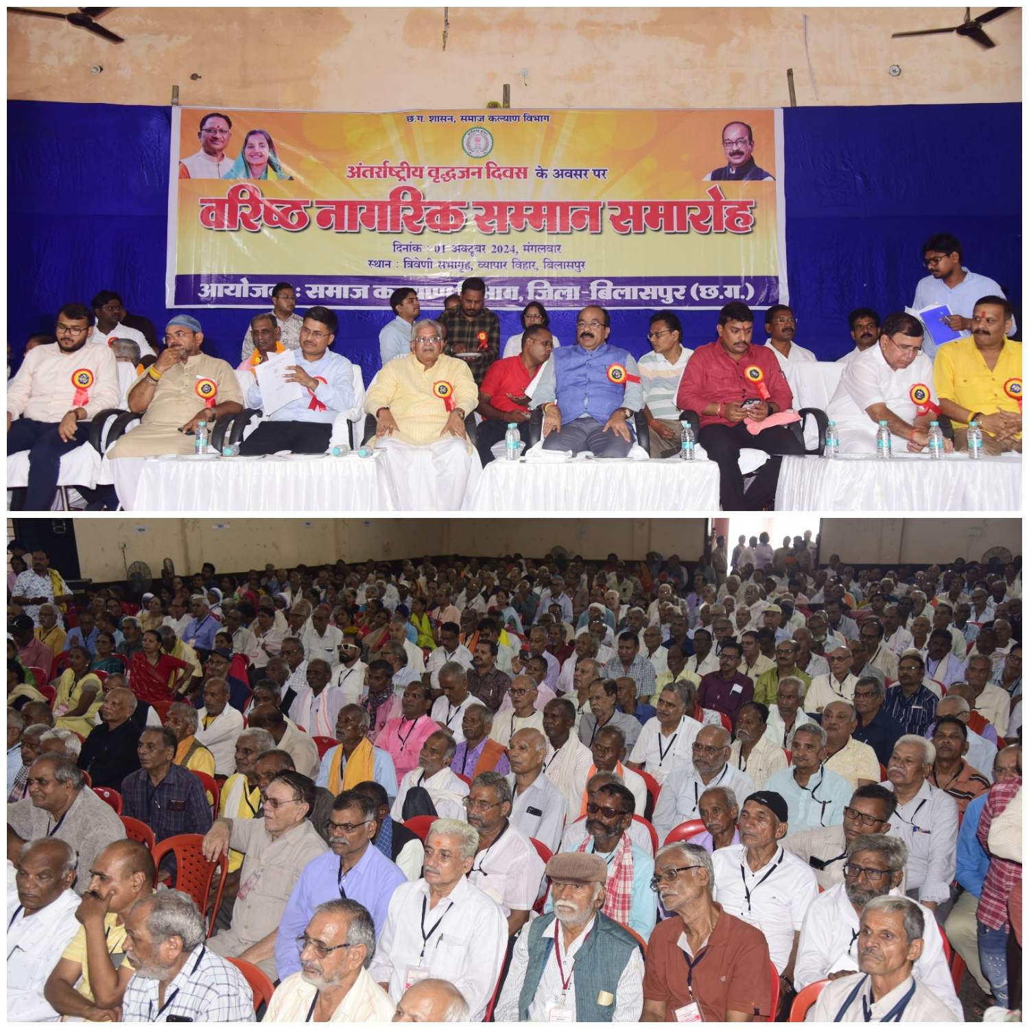 कार्यक्रम को संबोधित करते हुए उप मुख्यमंत्री श्री अरूण साव ने कहा कि प्रधानमंत्री नरेन्द्र मोदी देश के बुजुर्गों के लिए श्रवण कुमार बन उनकी सेवा कर रहे हैं। उन्होंने 70 साल से अधिक उम्र के वृद्धजनों के लिए 5 लाख रुपए तक के मुफ्त इलाज की व्यवस्था की है। प्रधानमंत्री श्री मोदी और विष्णु देव साय की सरकार ने बुजुर्गाे को सम्मानित किया है। उनके द्वारा आपके लिए कई योजनाएं संचालित की जा रही है। उन्होंने कहा कि त्रिवेणी उस स्थान को कहते हैं जहां तीन नदियों का संगम होता है। आज त्रिवेणी भवन में इतनी बड़ी संख्या में वरिष्ठजनों की मौजूदगी से यह जगह वास्तव में तीर्थ स्थान जैसा लग रहा है। बुजुर्गाे के आशीर्वाद से हमें ताकत मिलती है। उन्होंने कहा कि बुजुर्गाे का सम्मान आदि काल से हमारी संस्कृति का अटूट हिस्सा रही है। आप अनुभव का खजाना होते हैं जो हमारी बड़ी से बड़ी समस्याओं को चुटकियों में हल कर देते हैं। कार्यक्रम की अध्यक्षता कर रहे बिल्हा विधायक श्री धरम लाल कौशिक ने कहा कि छत्तीसगढ़ सरकार द्वारा बुजुर्गाे का सम्मान करते हुए उनकी बेहतरी के लिए योजनाएं चलाई जा रही है इसलिए हमारा छत्तीसगढ़ नई ऊंचाईयों को छू रहा है। वरिष्ठजनों के सम्मान से ही परिवार व्यवस्थित और संस्कारी रहता है। उनसे ही बच्चों को संस्कार और सीख मिलती है। परिवार को सही दिशा मिलती है।