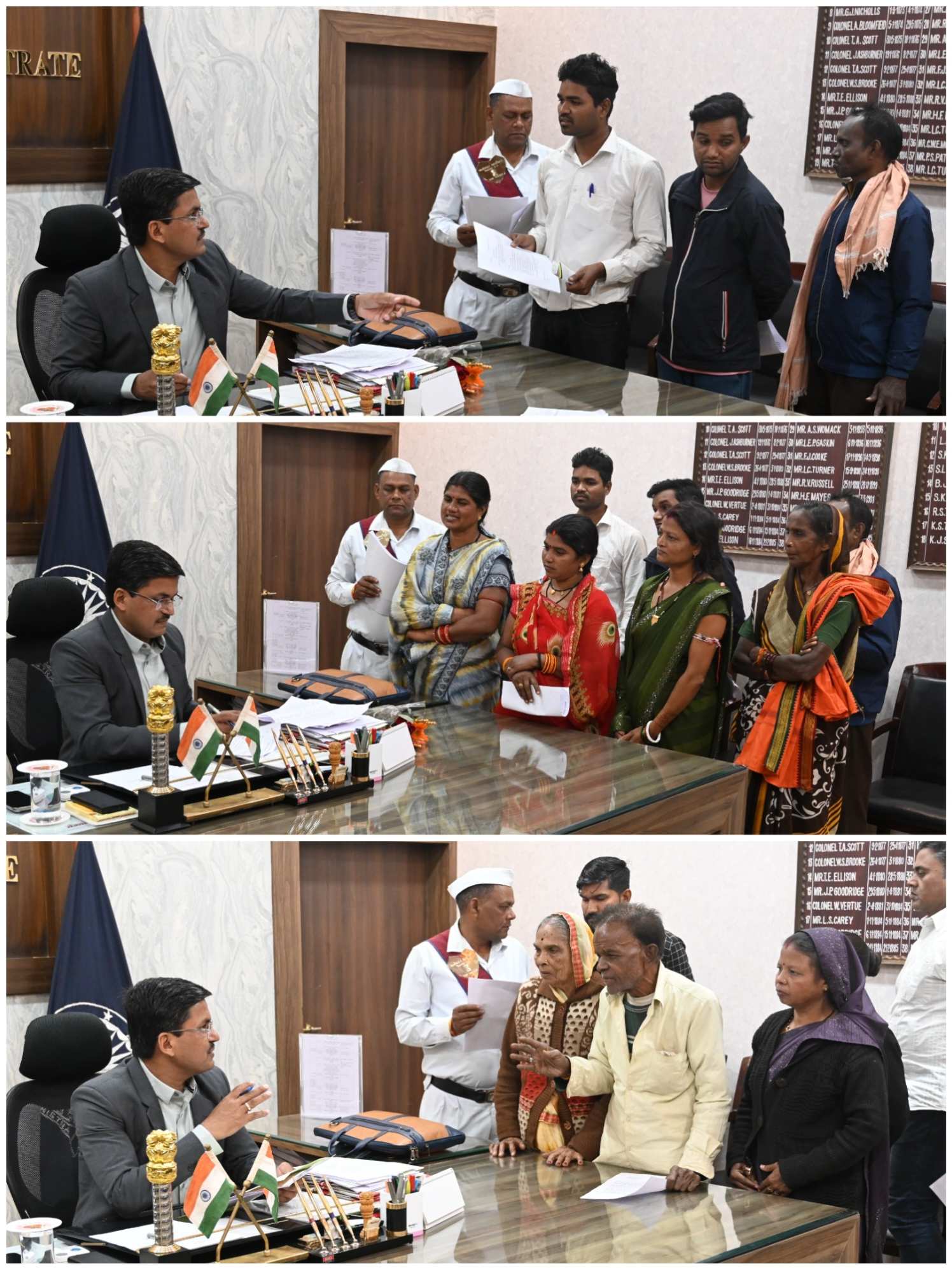 उसलापुर के दिलीप कुमार ने भी कलेक्टर से मुलाकात की। उन्होंने बताया कि उनकी पत्नी की आकाशीय बिजली गिरने से 9 माह पहले मौत हुई थी। तमाम औपचारिकता पूर्ण किये जाने के बाद भी तहसील कार्यालय द्वारा स्वीकृति के लिए जिला कार्यालय फारवर्ड नहीं किया जा रहा है। कलेक्टर ने एसडीएम तखतपुर को इसकी जांच कर तुरंत प्रकरण भिजवाने को कहा है। तखतपुर के पाली के ग्रामीणों ने सरपंच लल्लूराम साहू के खिलाफ कलेक्टर को ज्ञापन सौंपा। उन्होंने शासकीय जमीन पर कब्जा करने का आरोप लगाकर कार्रवाई की मांग की। एसडीएम तखतपुर को आवेदन भेजकर कार्रवाई करने के निर्देश दिए। बिल्हा विकासखण्ड के ग्राम हरदी कला के किसान श्रीचंद कौशिक ने भी कलेक्टर को ज्ञापन सौंपा। उन्होंने बताया कि उनकी कृषि भूमि पर फलाई ऐश से ईंट बनाने वाली उद्योग का राखड़ पहुंचता है जिससे प्रदूषण के साथ फसल भी बर्बाद हो रही है। एसडीएम बिल्हा को इसकी जांच एवं कार्रवाई करने के निर्देश दिए गए।