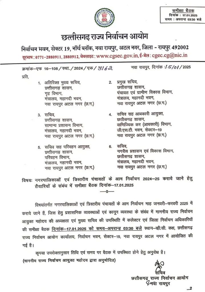 निर्वाचन आयोग ने चुनाव तैयारियों की समीक्षा के लिए 17 जनवरी को महत्वपूर्ण बैठक बुलाई है। यह बैठक दोपहर 3:30 बजे नया रायपुर में आयोजित की जाएगी, जिसमें कलेक्टरों को चुनाव की तैयारियों पर दिशा-निर्देश दिए जाएंगे।