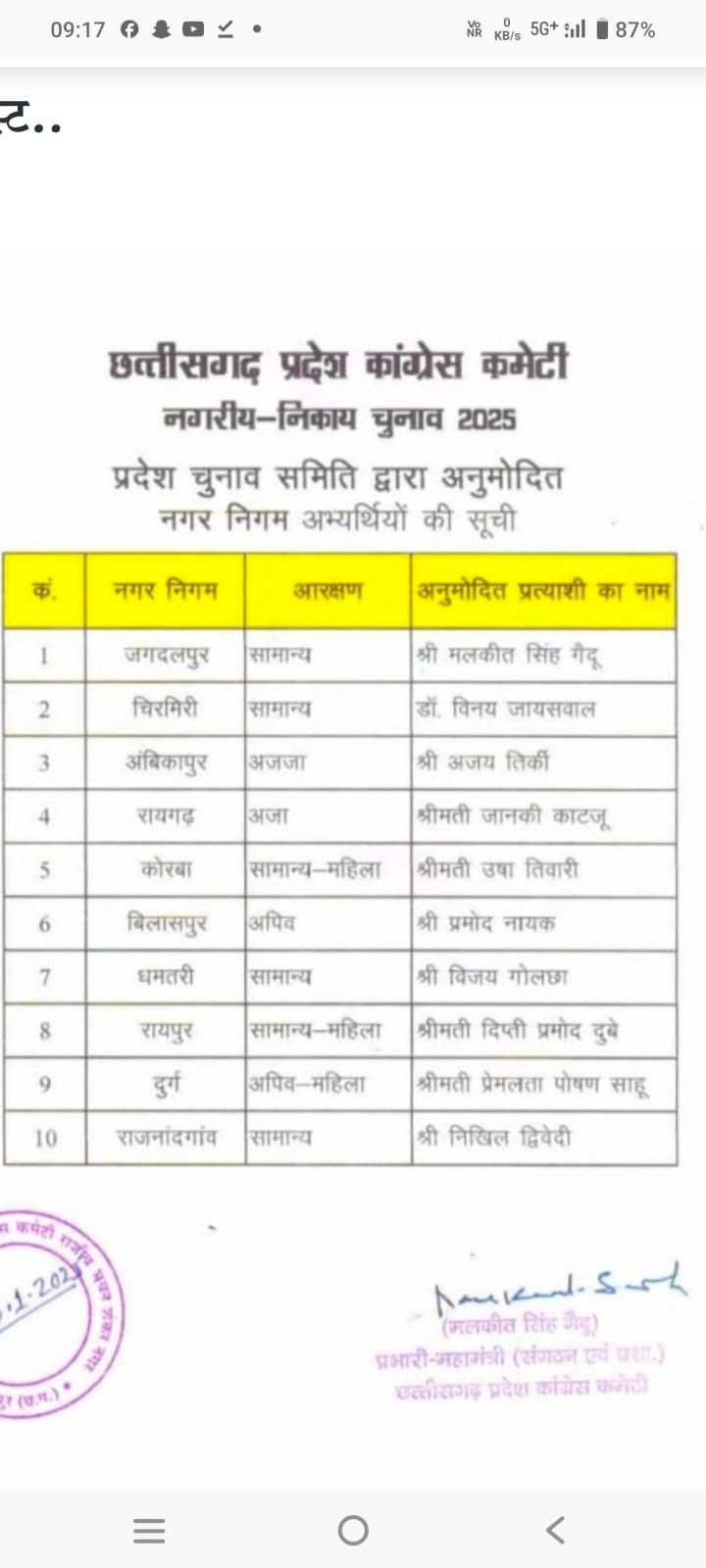 बिलासपुर :— बिलासपुर में कांग्रेस पार्टी ने वरिष्ठ नेता और पूर्व कांग्रेस कमेटी के अध्यक्ष डॉ. प्रमोद नायक को महापौर पद के लिए अपना उम्मीदवार घोषित किया है। डॉ. नायक का नाम सामने आते ही शहर के सभी वार्डों में उत्साह का माहौल बन गया है। कांग्रेस के इस निर्णय ने न केवल पार्टी कार्यकर्ताओं का हौसला बढ़ाया है, बल्कि स्थानीय नागरिकों के बीच भी उम्मीद की नई किरण जगाई है।