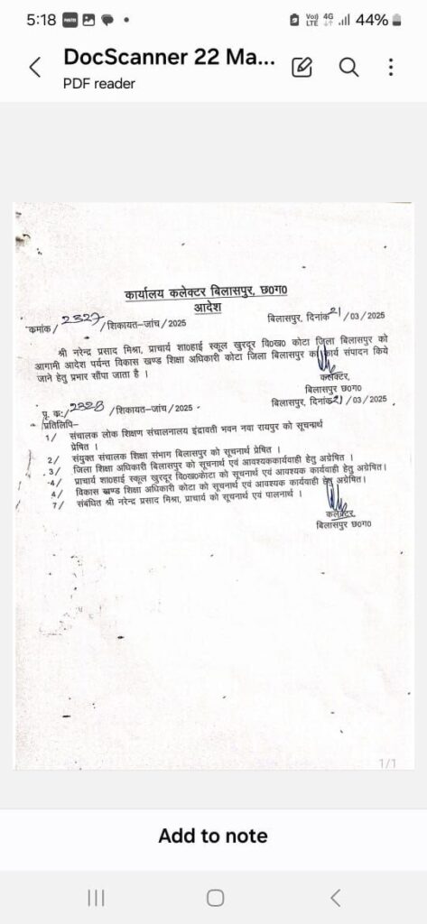 दरअसल कोटा विकासखण्ड की शिक्षिका श्रीमती नीलम भारद्वाज ने पखवाड़े भर पहले कलेक्टर द्वारा आयोजित कर्मचारी जनदर्शन में एक शिकायत पत्र सौंपा। उन्होंने बताया कि उनके शिक्षक पति के देहावसान उपरांत उनके स्वत्वों के भुगतान के लिए 1.24 लाख रूपये का रिश्वत मांगा जा रहा है। बीईओ को जानकारी देने के बाद उनके द्वारा भी कोई सुनवाई नहीं की जा रही है। कलेक्टर ने मामले को गंभीरता से लेते हुए उनके शिकायत को टीएल पंजी में दर्ज किया और जिला शिक्षा अधिकारी को मामले की जांच के निर्देश दिए। जांच में महिला द्वारा लगाया गया आरोप सही पाया गया। बीईओ श्री विजय पाण्डे एवं लिपिक एकादशी पोर्ते ने मिलकर महिला शिक्षिक को परेशान किया। बिना रिश्वत लिए उनके वास्तविक स्वत्वों को भुगतान नहीं किया जा रहा था। जान बूझकर विलंबित एवं परेशान किया जा रहा था। जांच टीम की रिपोर्ट के आधार पर बीईओ विजय टाण्डेय को हटा दिया गया है। उनके विरूद्ध विभागीय जांच के आदेश दे दिए गए हैं। तब तक के लिए उन्हे खुरदूर कोटा में प्राचार्य पद पर कार्य करने के लिए निर्देशित किया गया हैं। वहीं सहायक वर्ग 2 श्री एकादशी पोर्ते को निलंबित कर दिया गया है। निलंबन काल में श्री पोर्ते को रतनपुर हायर सेकेण्डरी स्कूल में मुख्यालय नियत किया गया है। नियमानुसार उन्हें जीवन निर्वाह भत्ता दी जायेगी।